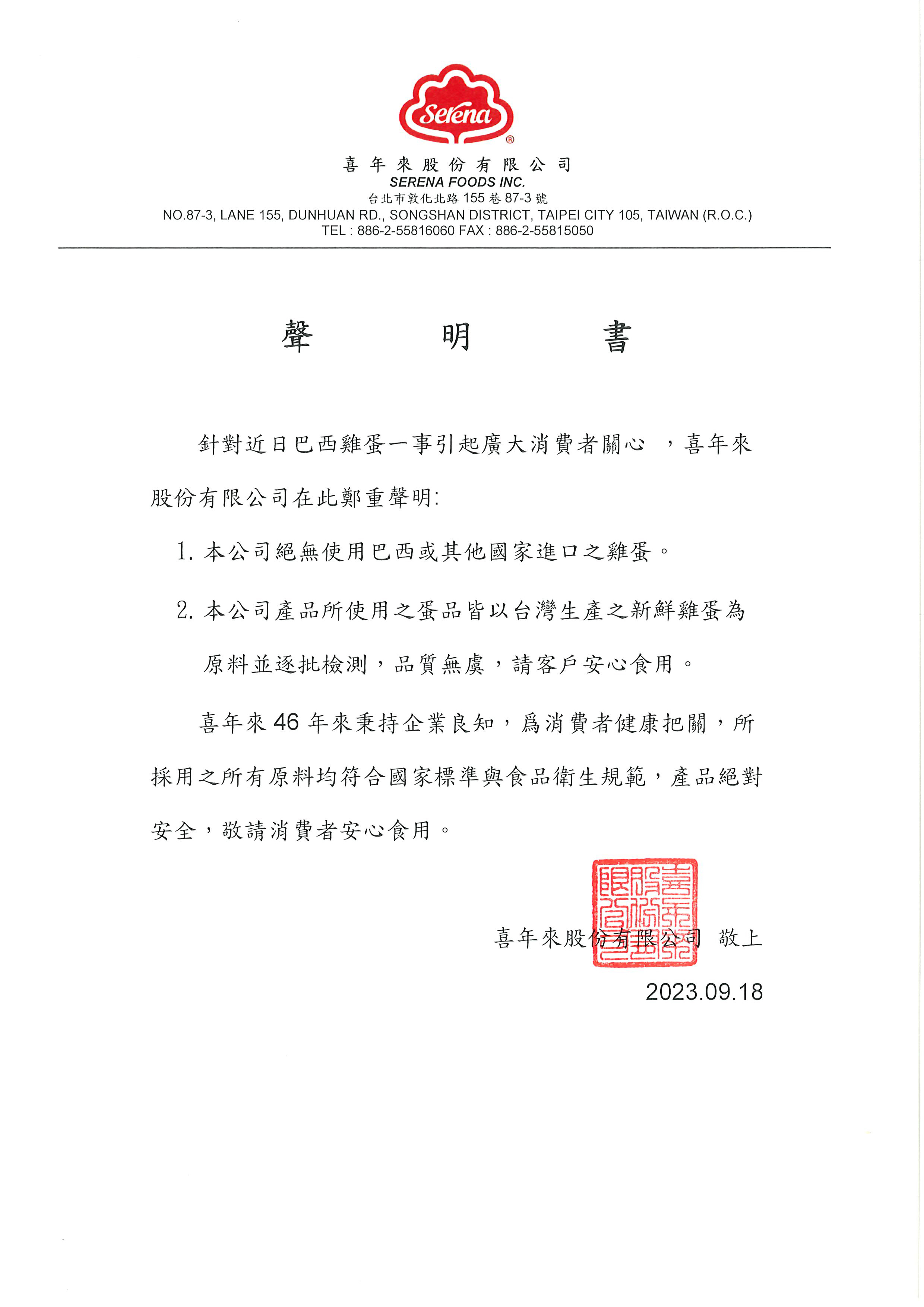 本公司絕無使用巴西或其他國家進口之雞蛋,敬請安心食用。