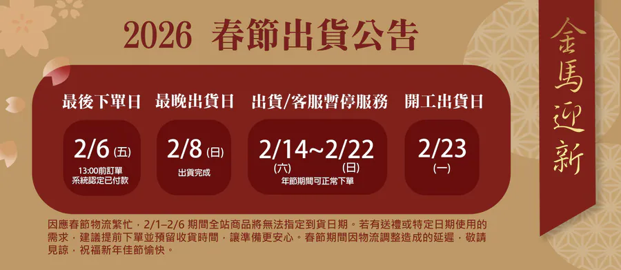 ● 春節期間,官網商品仍可正常訂購,商品將於年後2/23(一)陸續出貨。