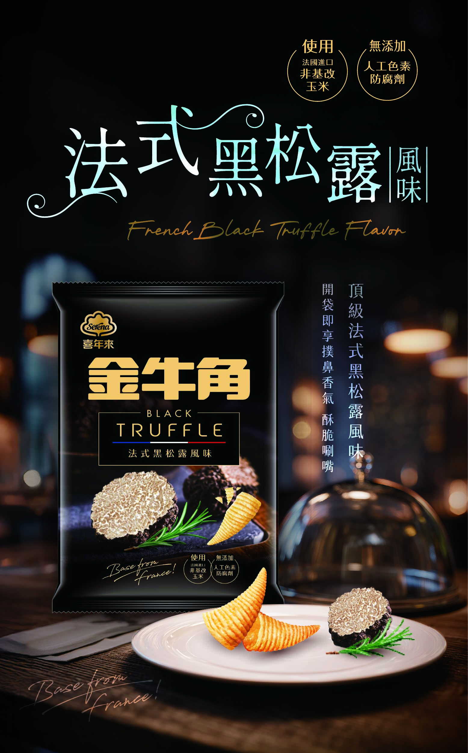 玉米膨化團粒(非基因改造玉米、糖、脂肪酸甘油酯、小蘇打、鹽)、椰子油、松露風味香料粉(蔗糖、麥芽糊精、食鹽、香料、L-麩酸鈉、磷酸鉀、二氧化矽、中鏈三酸甘油酯、阿拉伯膠、檸檬酸、葡萄糖、5'-鳥嘌呤核苷磷酸二鈉、5'-次黃嘌呤核苷磷酸二鈉、醋酸)