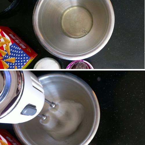 2.將蛋白放置在無油無水氣乾淨的鋼盆裡,用打蛋器打到有粗泡後加1/2的糖,泡沫變細後加剩餘的糖,一直打到蛋白霜完全硬挺至硬性發泡。這時的蛋白霜會成效美麗的珍珠色澤。